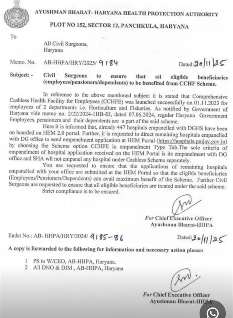जानकारी के मुताबिक, इस योजना के तहत हरियाणा सरकार के रेगुलर कर्मचारी, पेंशनर और उनके आश्रितों को इस योजना का लाभ मिलेगा। ये व्यापक कैशलेस स्वास्थ्य सुविधा (CCHFE) 1 नवंबर 2023 को सफलतापूर्वक शुरू की गई है। इसको लेकर सभी जिलों के सभी सिविल सर्जनों को निर्देश भी जारी किए गए हैं।