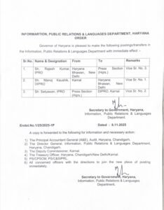 दरअसल, राजेश कुमार को प्रैस शाखा (मुख्यालय), मनोज कुमार को हरियाणा भवन, नई दिल्ली और सत्यवान को जिला सूचना, जन सम्पर्क अधिकारी, करनाल का कार्यभार सौंपा गया है।